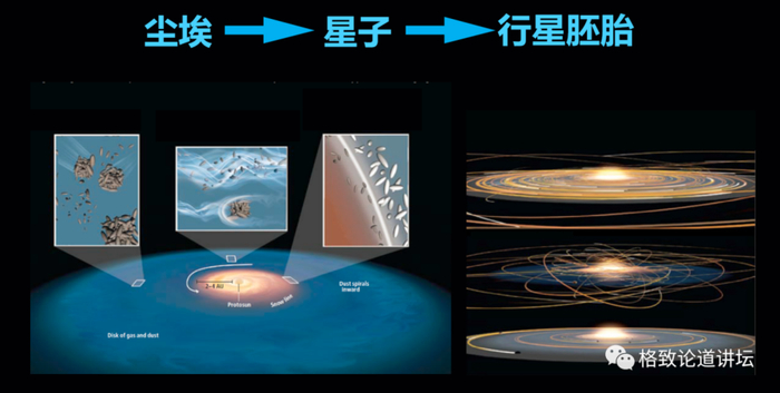 这个通道里面,盘里不光有气体,还有尘埃,尘埃像我们通常所说的PM2.5,很小的颗粒,相互碰撞,粘在一起,逐渐长大。