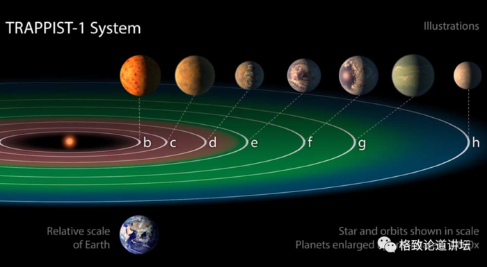 它和太阳系有一个显著不同就是这个非常致密,相当于我们在太阳系水星轨道内,摆上7颗行星,而且他们排列非常致密,排布也比较均匀。
