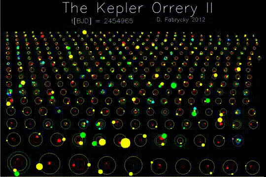 看这个图上有很多旋转的一些圆圈,这就是天文学家找到的行星,大家可以看到这个行星距离中央的恒星距离远近不同,颜色也不同,不同的颜色表示它的温度也不同。