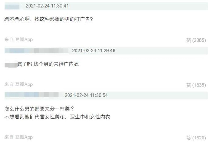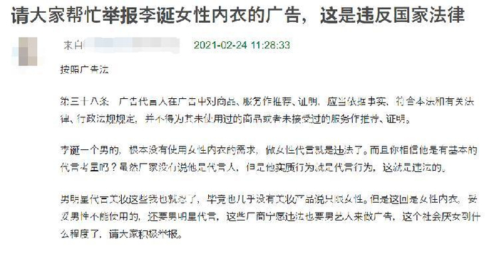 网友质疑称,“李诞一个男的,根本没有使用女性内衣的需求,做女性代言就是违法了。而且你相信他是有基本的代言考量吗?虽然厂家没有说他是代言人,但是他实质行为就是代言行为,这就是违法的。”“男明星代言美妆这些我也就忍了,毕竟也几乎没有美妆产品说只限女性。但是这回是女性内衣,妥妥男性不能使用的,还要男明星代言,这些厂商宁愿违法也要男艺人来做广告,请大家积极举报。“
