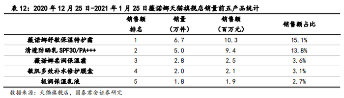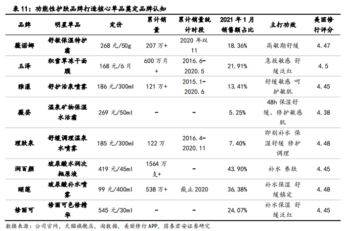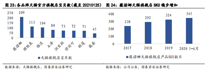 头部品牌不断扩充产品线,从爆款单品走向全品类发展。龙头功能性护肤品牌多以爆款单品起家,随后不断扩充产品线、突破天花板。以薇诺娜为例,公司继明星产品舒敏保湿特护霜后,又推出了防晒美白、保湿补水、控油祛痘等多个产品系列,并打造出清透防晒乳、柔润保湿霜等爆款产品。从淘数据统计的2021年1月薇诺娜天猫旗舰店GMV看,排名前五的单品和GMV占比分别为:舒敏保湿特护霜(15.1%)、清透防晒乳(13.8%)、柔润保湿霜(3.6%)、补水修护膜(3.1%)、极润保湿乳液(2.7%)。雅漾在明星产品舒泉调理喷雾之后又打造了修护舒缓保湿霜、婴儿舒缓润肤霜等爆款产品,近期公司又推出了新品高阶CE霜,开始切入抗氧抗初老市场。从各大功能性护肤品牌的产品线布局看,雅漾和薇诺娜的产品最为丰富,雅漾除了男士系列外各功能系列均有布局,薇诺娜目前除了男士和抗衰系列外各功能系列都有布局。从天猫旗舰店的SKU数量看,薇诺娜、理肤泉和雅漾位居前列,分别为209、113、104个,薇姿SKU相对较少,为45个。综合以上分析,薇诺娜、雅漾和理肤泉在产品线拓展方面处于同业领先水平,为品牌创造了广阔的成长空间,也是品牌市场份额领先的重要原因之一。