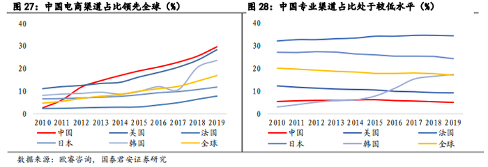 全球化妆品渠道持续向线上渗透,中国电商渠道占比领先,专业渠道占比相对落后。从国内化妆品消费渠道看,自2010年以来电商渠道占比一路攀升,而传统的商超和百货渠道占比则持续下降,电商渠道自2018年起跃居第一大渠道,2018年和2019年占比分别为26%和30%。对比全球化妆品消费渠道,电商渠道也呈现快速增长的趋势,2018年和2019年占比分别为14.5%和17%,仅次于第一大渠道CS渠道。而从专业渠道角度看,中国专业渠道(医院渠道+药房渠道)发展程度落后于全球市场,2019年中国专业渠道销售占比仅为5.1%,而全球专业渠道销售占比达17.1%,尤其是日本、法国和韩国,2019年专业渠道销售占比达34.5%、24.4%、17.4%。