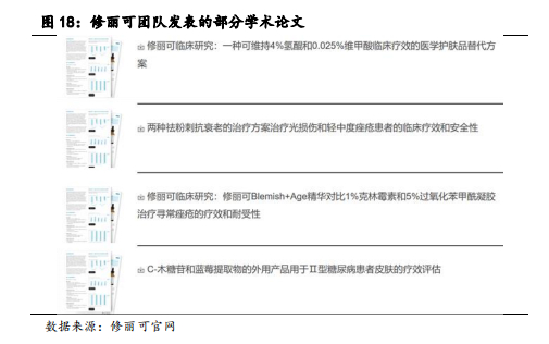 高端专业护肤品牌代表,“整全护肤”+全渠道战略促高速发展。得益于科学护肤、专业研发的品牌基因,修丽可从创立之初就定位于中高端市场和专业化渠道,在美国修丽可只通过医疗诊所等专业渠道销售,其产品定价也远高于其他皮肤学护肤品牌。在中国市场,修丽可前五年专注于专业诊所渠道,得到了专业医生的信任和推荐,此后开始布局电商和百货渠道。修丽可率先提出“整全护肤”的理念,将科学护肤、家庭护理、专业美容三大场景结合,以专业诊所+电商+精品店铺立体化的渠道矩阵满足消费需求、抢占年轻市场。目前修丽可在中国与近千家专业诊所、美容SPA网点合作,开设了几十家百货/购物中心门店,修丽可天猫旗舰店粉丝数量已达428万人,随着国内轻医美市场和电商渠道蓬勃发展,修丽可品牌也迎来了爆发式增长,根据欧睿统计2017-2019年修丽可品牌零售额从1.2亿元激增至6.3亿元,且销售增速逐年提升。