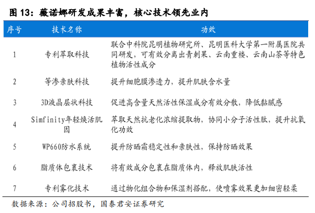 基础研究实力雄厚,技术和专业渠道优势奠定敏感肌护理专家形象。公司与昆明医科大学第一附属医院、中国科学院昆明植物研究所等国内领先的专业机构合作,产品和国内外知名皮肤学家联合研制,经过多年研发投入,公司已在植物基础研究、现代配方技术等方面处于国内领先地位,特别是在利用高原特色植物提取物有效成分制备和生产敏感肌肤护理产品方面具有较强的技术优势。薇诺娜皮肤学专家团队发表了128篇基础研究和临床验证方面的高质量学术论文,推动了13篇国家级皮肤科诊疗共识及指南的制订和发布,公司拥有境内有效专利46项,掌握11项核心技术,特别是在利用高原特色植物提取物有效成分制备和生产敏感肌肤护理产品方面具有较强的技术优势,应用核心技术实现的收入占总营收的95%以上,树立了针对敏感性肌肤产品的行业标杆。薇诺娜在植物活性提取物的功效研究方面已经具有国际领先优势,还历经数十家知名医院皮肤科的效果观察,产品安全性和功效性都得到充分验证,因此公司产品得以广泛进入医院、药房、诊所等专业渠道,进一步强化了敏感肌护理专家的品牌形象。2019年,薇诺娜品牌被化妆品行业权威杂志《化妆品报》评为“敏感肌护理品类第一名”。