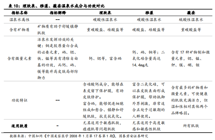 三大国际品牌活泉水成分差异明显,主打功效各有侧重。三大国际皮肤学级护肤品牌理肤泉、雅漾、薇姿都以活泉水为成分之源,但三者的活泉水成分和功效存在明显差异,其中薇姿含有最多的矿物质和微量元素,可使肌肤充满活力,适用于所有肤质,但对敏感肌的针对性不强。而雅漾和理肤泉的活泉水对敏感肌的针对性更强,比如雅漾的温泉水中富含二氧化硅,可以在皮肤表面形成保护膜,非常适合正处于过敏期的人群使用;理肤泉的温泉水中一方面含有硅酸钙成分,能够在表皮留下保护膜,修护屏障受损肌肤,另一方面富含硒,能够促进细胞组成和愈合、镇静和舒缓肌肤,可以舒缓痘痘肌和皮炎肌肤。