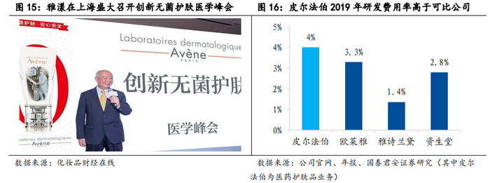 以雅漾为例,雅漾母公司皮尔法伯为实力雄厚的医药集团,成立于1962年,皮尔法伯研究团队自1974年开始进行皮肤生理学研究,1975年收购了雅漾活泉水,并制定了全面的科学研究计划,1990年雅漾品牌诞生。截至2019年,皮尔法伯集团已经获得1392项皮肤学护肤品领域的专利或专利申请。玉泽由上海家化联合瑞金医院、华山医院等皮肤科权威共同研发而成,上海家化2003年便开启了皮肤学领域“医院与企业共创”的合作模式并延续至今,6年临床观察实践为2009年玉泽推出第一代明星产品“玉泽皮肤屏障修护身体乳”奠定了坚实基础。研发是功能性护肤品牌的立身之本,对比一般化妆品公司,功能性护肤企业普遍更重视研发投入,2019年研发费用率介于2.8%-5%之间,一般化妆品公司研发费用率介于1.9%-2.5%之间。