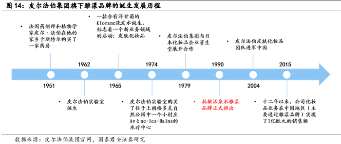 雅漾品牌源自实力雄厚的医药企业,皮肤学护肤业务已成为集团主要营收来源。皮尔法伯集团创始人是法国药剂师和植物学家皮尔法伯先生,其于1951年在家乡卡斯特尔购买了一家药房,开启了创业之路。1959年皮尔法伯开发出第一款处方药大获成功,1965年皮尔法伯集团推出了含有洋甘菊的洗发水开启了全新的皮肤化妆品领域,标志着公司从健康到美丽的企业理念转变。1974年皮尔法伯实验室购买了雅漾水疗中心,并通过多年研究证明活泉水的治疗功效,在此基础之上,皮尔法伯集团于1990年正式创立了抗敏护肤品牌雅漾。经过数年的发展,皮尔法伯现已成长为法国第三大制药集团,欧洲第一、全球第二大皮肤学级护肤品集团,具备雄厚的皮肤学护肤研发实力。截至目前,公司共拥有包括雅漾在内的九大皮肤学护理品牌,但雅漾仍然是最主要的核心品牌,2019年雅漾品牌以9.6%的市场份额,仅次于理肤泉(市占率11.8%)位居全球皮肤学级护肤品市场市占率第二名。皮尔法伯集团在皮肤学化妆品领域深耕多年,2019年公司医疗美容化妆品营收占比已达60%,远超制药板块39%的营收占比,成为公司最主要的收入来源。
