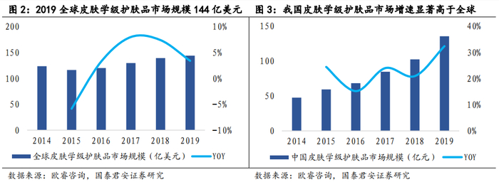 我国功能性护肤品渗透率提升空间广阔,仅敏感肌护理市场空间有望达680亿元。根据Polaris统计,2018年全球功能性护肤市场规模为525亿美元,预计2019-2026年行业复合增长率为8.2%,以2019年估算行业规模测算广义功能性护肤品在全球护肤品市场的渗透率为41%,其中亚太地区为功能性护肤品市场增速最快区域。而从皮肤学级护肤品市场看,根据欧睿统计,2019年全球皮肤学级护肤品市场规模为144亿美元,在全球护肤品市场的渗透率为10%,2014-2019CAGR为3.12%。2019年我国皮肤学级护肤品市场规模为135.5亿元,2014-2019年CAGR高达23.2%,增速不仅远高于全球市场增速,也远高于国内化妆品行业全量增速(2014-2019年CAGR为 9.9%)。对标成熟市场,2019年我国皮肤学级护肤品在护肤品行业的渗透为5.5%,远低于美国14.7%和法国43%的渗透率。目前我国核心化妆品消费人群约3亿人,按照女性敏感肌发生率36%估算,敏感肌潜在人群约1.08亿人,按照敏感肌人均化妆品消费额90美金/年测算,敏感肌护理市场空间可达680亿元。