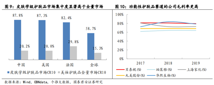 全球功能性护肤品行业呈现较高集中度,头部企业优势显著。从全球和主要市场皮肤学级护肤品行业集中度看,皮肤学级护肤品集中度明显高于护肤品全量市场。根据欧睿统计,2019年中国、美国、法国与全球皮肤学级护肤品市场CR10分别为87.8%、87.3%、82.4%和58.7%,而相应的护肤全量市场CR10仅为20.2%、20%、29.8%和15.3%。高市场集中度形成了对头部企业更有利的竞争格局,从上市公司角度看,专注于敏感肌护理的贝泰妮、专注于玻尿酸护肤的华熙生物毛利率均在79%左右,而其他化妆品企业护肤业务毛利率一般介于64%-73%之间。