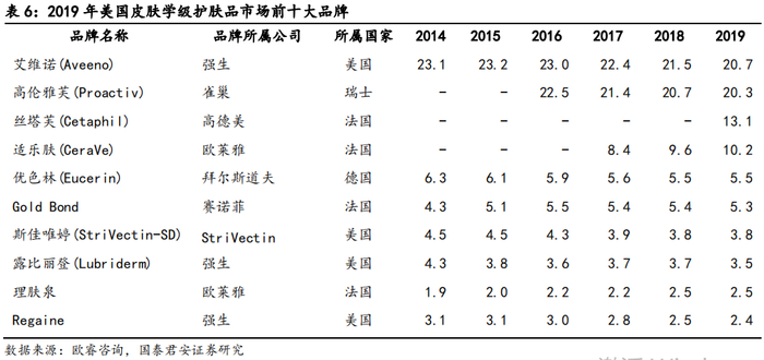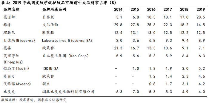 功能性护肤品凭借产品力补强品牌力,国货龙头薇诺娜跻身全球十强。目前全球规模领先的功能性护肤品牌主要包括法国皮尔法伯集团旗下的雅漾、法国欧莱雅集团旗下的理肤泉、薇姿以及美国强生集团旗下的艾维诺等,而国内功能性护肤品牌主要包括贝泰妮旗下的薇诺娜、华熙生物旗下的润百颜和夸迪、上海家化旗下的玉泽以及鲁商发展旗下的颐莲和瑷尔博士、巨子生物旗下的可复美和可丽金、创尔生物旗下的创尔美等。由于化妆品属于后验品,即只有当消费者购买并坚持使用一段时间以后才知道产品效果,因此品牌知名度和美誉度对于消费者决策的影响较大。而在功能性护肤品赛道,品牌往往以特定功效为卖点,并在细分领域不断积累产品口碑以提高用户信任度,尤其是皮肤学级护肤品领域,产品功效往往经过临床验证和皮肤科医生背书,使得消费者对国货品牌的信任度丝毫不逊色于国际品牌。根据欧睿统计,2019年我国皮肤学级护肤品市场规模最大的品牌是薇诺娜,市占率高达20.5%,凭借对敏感肌护理的潜心研究、长期积累以及电商渠道的强势发力,薇诺娜2014-2019年零售额维持了近80%的复合增长(欧睿口径),由此薇诺娜顺利跻身全球皮肤学级护肤品市场份额第九名,市占率达2.8%。