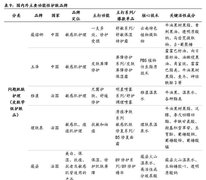 美妆消费不断升级,功能性护肤赛道呈现细分化发展趋势。修复受损的皮肤屏障是治疗敏感性皮肤的重要措施,研究表明单一使用舒敏保湿类护肤品或与药物、医美等联合治疗能有效缓解敏感性皮肤的症状,因此相关护肤品大受追捧。随着消费者对护肤知识和自身皮肤状况的了解日渐深化,美妆消费日趋成熟,消费者从基础化妆品升级为功能属性更强的专业化妆品,再到见效更快的医美,需求不断升级且不可逆。功能性护肤品开始呈现细分化发展趋势,按照服务人群的差异化功能性护肤品可以分为两大类:一类是针对问题肌肤功效护理的皮肤学级护肤品,根据欧睿的定义,皮肤学级护肤品是采用温和科学的配方,强调产品安全性和专业性,适用于肌肤敏感等问题的肌肤护理产品,代表品牌有薇诺娜、玉泽、雅漾、理肤泉、薇姿等;另一类是面向相对普通肌肤的功效护肤品,通过针对性的添加更高浓度的活性成分、优化产品配方,增强美白、保湿、防晒、抗皱、毛孔收敛等效果,代表品牌润百颜、颐莲、修丽可等。