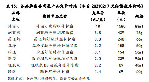 功能性护肤品牌定位集中于中端和高端市场,修丽可、润百颜、薇诺娜定价处于同业领先水平。我们对比了部分功能性护肤品牌热销霜类产品天猫旗舰店的克单价,从普通肌肤功效护理品牌看,龙头品牌定位而于中高端市场,修丽可王牌产品皮脂膜修护霜单价高达18元/克,润百颜新品屏障调理面霜定价也达到5.8元/克;而皮肤学级护肤品牌主要定位于中端市场,客单价介于2.2-3.8元不等,其中薇诺娜定价相对较高,薇诺娜舒敏保湿特护霜定价为3.8元/克;颐莲定位相对平价,其蜗牛修护霜定价为1.4元/克。