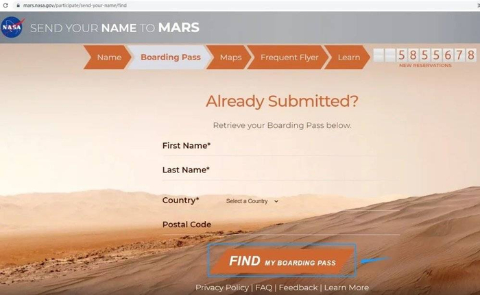 如果找不着当时登记的火星船票了也不用着急,进入这个链接:https://mars.nasa.gov/participate/send-your-name/find,填写当时的船票信息就能找回啦!