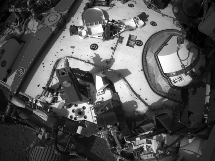 这张照片是毅力号着陆后的第二个火星日里,左导航相机(NavCam)拍摄的火星车甲板照片。