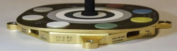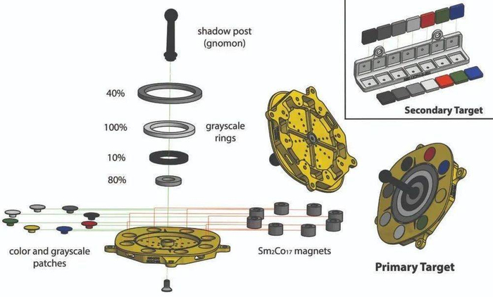 仔细看主定标板,中间的几个环是灰度定标色块,凸起的杆子可以作为日晷使用,周围的一圈则是彩色定标色块。