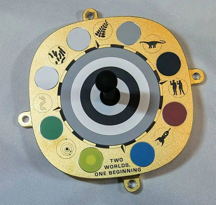 这块标牌上有一幅极简的线条画,标明了地球-太阳-火星的相对距离。在太阳四射的光芒中,同样用摩斯密码隐藏着一句话:“Explore as one”。