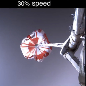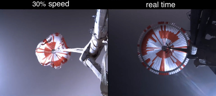 这是一个逆向视角,相当于看着降落伞往远离自己的方向展开,这是背罩(backshell)上安装的相机向上拍摄的。