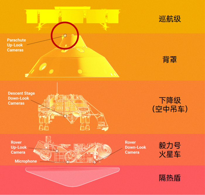 毅力号结构拆解和本次拍摄降落伞的相机所在位置(红圈),来源:NASA/JPL-Caltech