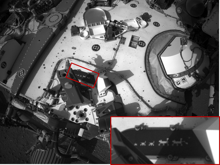 再仔细观察一下这张看似平平无奇甚至有点乱糟糟的甲板照片,可以发现NASA在毅力号火星车上藏了一张火星车全家福。