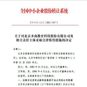 中国网科技2月25日讯 据全国中小企业股份转让系统网站消息,近日,新三板创新层公司圣商教育(430277)因关联方不当占用公司资源以及年报信息披露不准确,全国股转公司要求公司、时任公司董事长袁力、时任公司董秘王军超责令改正。