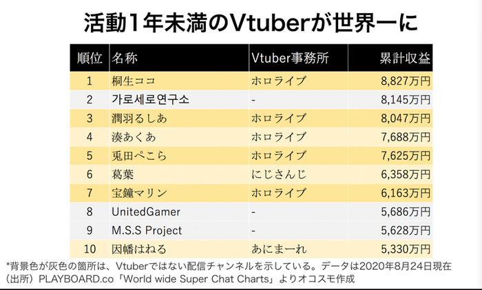 除去广告收入等收益,排名第一的VTuber(即Virtual YouTuber的简称,意为活跃在YouTube上的虚拟Up主)桐生可可( 日文名:桐生ココ,2019年12月28日开始活动,主要业务为游戏直播、节目主持、杂谈等),仅Superchat收入就达到了939万人民币;而2019年世界排名第一的日本VTuber凑阿库娅(日文名:湊あくあ,2018年7月末开始活动,主要业务为游戏直播、音乐等),全年Superchat收入仅有209万人民币。