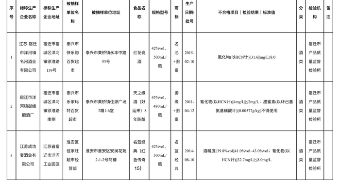 泰州市泰兴市快乐购百货超市销售的标称江苏·宿迁市洋河镇名河酒业有限公司生产的红花瓷酒,氰化物(以HCN计)不符合食品安全国家标准规定。检验机构为宿迁市产品质量监督检验所。