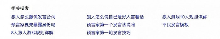 现在在百度搜索“狼人杀”,相关搜索仍然被各种有关玩法和规则的提问占据。