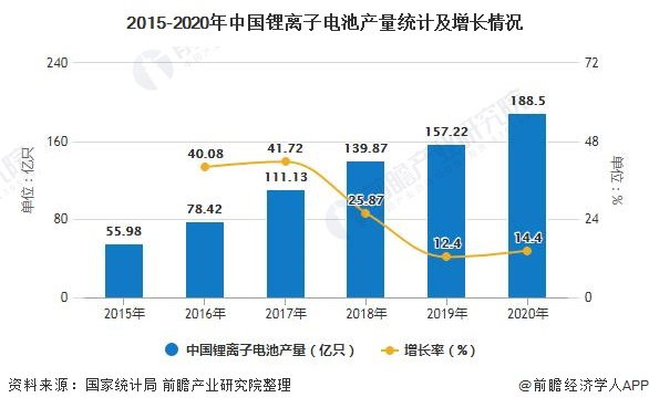 近年来随着3C产品对锂电池需求量的稳定增加,以及新能源汽车的市场规模逐步扩大和储能电池的需求扩大,我国锂电池产量规模逐年增加。2019年,我国锂离子电池产量157.22亿只,同比增长12.40%。截止至2020年全年中国锂离子电池产量达到188.5亿只,累计增长14.4%。
