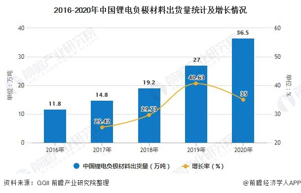 负极材料作为锂电池另一个关键材料,2016-2019年其出货量持续增长,截止至2020年中国锂电负极材料出货量达到36.5万吨,同比增长35%,市场增幅超预期,主要系全球各领域锂电池需求大幅增长所致。