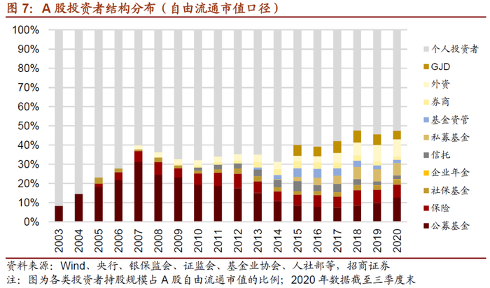 进一步的,我们考察从A股市值中剔除大股东及其关联方持股后的自由流通市值,以进一步观察个人与机构投资者相对持股变化。长期以来,A股个人投资者持股规模高于机构投资者,但总体而言,个人投资者占比呈现下降趋势,机构投资者占比从2015年以来趋势性提升,A股投资者“机构化”正在稳步进行中。截至2020Q3,在A股自由流通市值中,机构投资者合计占比47.4%,个人投资者占比52.6%。