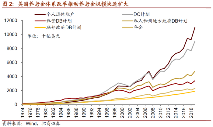 美股投资者结构的变化离不开美国养老金体系的重大变革。通货膨胀的严峻态势使得养老金面临着严重的缩水问题,1974年美国出台《雇员退休收入保障法》,明确了养老金的税务问题,强化了对于养老金入市的监管和风险控制,并规定养老金计划发起人的最低缴费标准,明确要求企业将确定收益型养老金计划DB的资金运作模式由现收现付制改为基金积累制,进一步强化了雇主在设立DB时的责任。另外该法案还创立了个人退休账户(IRAs)模式并为这一模式设立税收优惠制度。