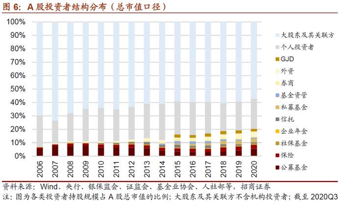 从A股市场的投资者结构来看,以产业资本为主的大股东及其关联方长期都是A股市场持股规模最高的投资者,不过其持股在A股总市值的占比呈现稳中有降的趋势。2006-2012年期间,大股东及其关联方持股规模占比为60%-70%;2013年以来基本相对稳定在六成左右,但整体有所下降,截至2020年三季度末,该比例已经降至约57%。