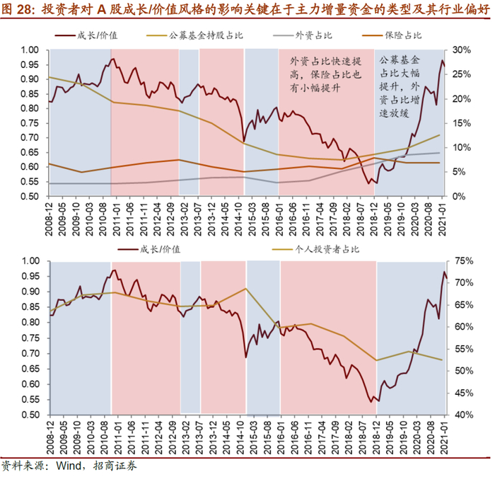 (4)A股市场的成长价值风格与机构占比的高低并无直接关系,关键在于不同阶段主力增量资金的类型及资金的行业偏好。