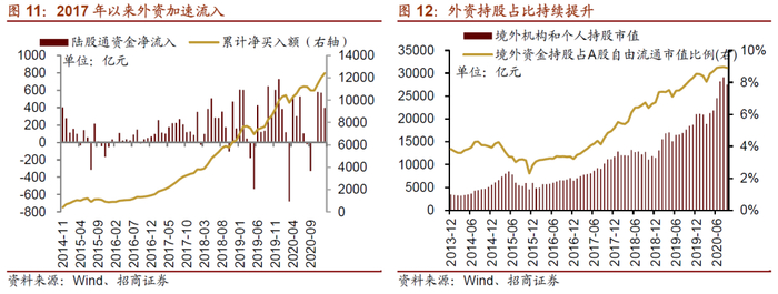 2014年末沪港通开通,开启外资投资A股的新篇章,尤其2017年以来外资加速流入。2017-2020年期间年度净流入额分别达到1997亿元、2942亿元、3517亿元、2089亿元,外资持股在A股自由流通市值中的占比也从2016年末的3.22%提高至2020年三季度的8.91%,成为影响A股市场的重要力量。