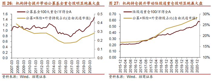 究其原因,以公募基金、保险、北上资金为代表的专业机构类投资者更偏好大盘股,在这些机构占比提升的阶段大盘股占优。以公募基金持仓为例,2020年四季报主动偏股公募基金的重仓持股中,前50大重仓股、前100大重仓股、前300大重仓股等不同组别的股票市值依次下降,可见持仓占比越高的股票其市值越高,意味着公募基金总体更偏好大市值的龙头股。此外,陆股通前100大重仓持股与公募基金重仓股重合度高,达到六成,共同强化了2016年以来A股的大盘风格。