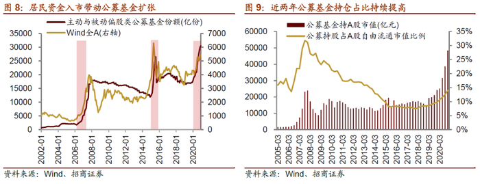 另外,2017年以来公募基金持股规模在A股自由流通市值占比持续提高,尤其在2019年和2020年,在大量居民资金通过基金入市的热潮下,公募基金规模稳步扩张,进一步带动了公募基金在全市场持股比例的提升。