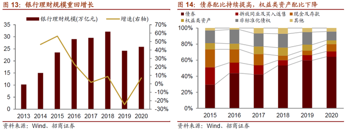 首先,银行理财是各类资管产品中规模最高的,且银行理财规模在经历了2019年的收缩后,在2020年重回扩张,2020年末银行理财产品规模25.86万亿元,同比增长6.9%。