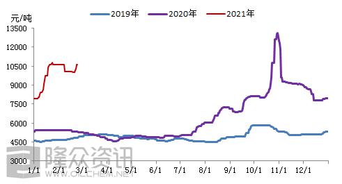【导语】不出十五都是年,2021年法定春节假期结束后,DMF各家工厂积极推涨带动行情节奏,而此轮涨势早已褪去青涩外衣呈现老练路线,端详之下,DMF尚在历史高位蠢蠢欲动,下游各行业心态可想而知。至截稿前,华东市场参考10600-10700元/吨,华南市场参考10900-11000元/吨承兑送到。