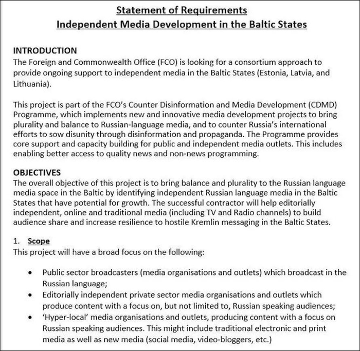 这次投标响应的是英国外交部的招标请求,后者希望投标方能够协力实施一项有俄罗斯记者和网红们参加的英国主题之旅,好让这些人产生“态度上的变化”,并就他们“对英国的看法”施加积极影响。