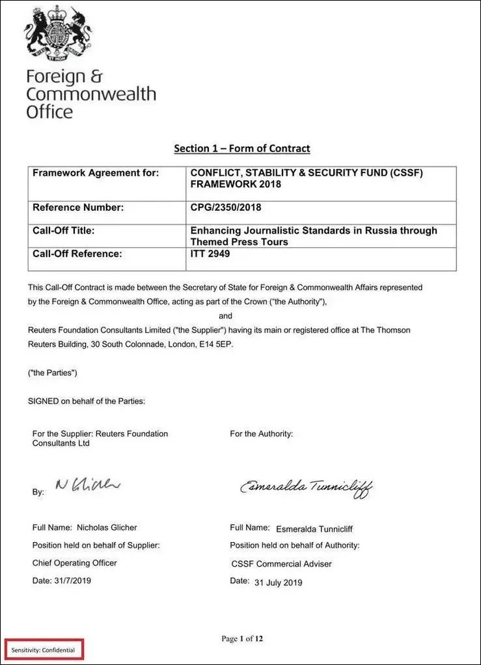 最终,路透社似乎成功拿下了竞标,因为他在2019年同英国外交部的冲突、稳定与安全基金(Conflict, Stability & Security Fund)签订了一份合同。但这两家似乎都不想让公众知道他们在一个旨在对抗俄罗斯的项目上的合作。合同上标有“严格保密”字样。