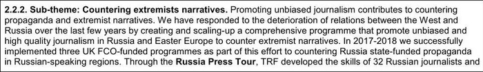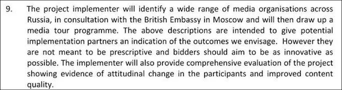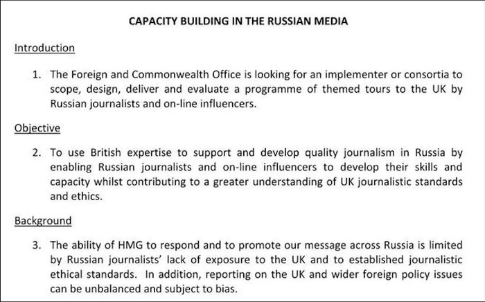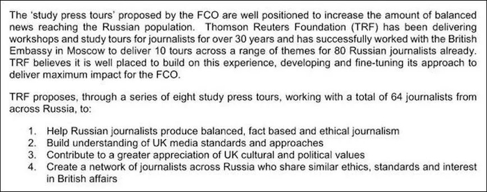 根据这份材料,路透社曾代表英国驻俄罗斯大使馆为80名俄罗斯记者进行过此类旅行培训。他们还更进一步,承诺将通过更多的培训项目以促进“英国文化和政治价值观”并“建立一个遍布俄罗斯的记者网络”,这些人会因共同的“对英国事务的兴趣”联系在一起。
