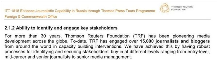 2017年,汤森路透基金会递交了一份正式的投标书,他们会和由英国驻俄罗斯大使馆代表的外交大臣签订合同,开展一个“在俄媒体能力建设”项目。