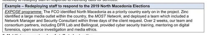 “灰色地带”指出,贝灵猫为北马其顿媒体(Most Network)提供了培训项目,该项目由北约和美国政府资助的大西洋理事会支持。2019年的北马其顿议会选举,亲北约候选人在这场很可能决定该国是否加入北约和欧盟的选举中赢得了胜利,英国外交部及其盟友均有出力。