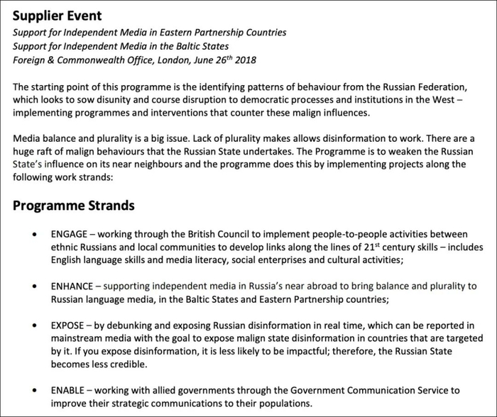 到了2019年,英国外交部提出了一项更加激进的计划,他们试图渗透俄罗斯媒体,借助在英国接受培训的俄罗斯记者形成的影响力在网络上传播自己的观点,以“对抗俄罗斯政府对媒体和信息空间的叙事权和支配地位”。