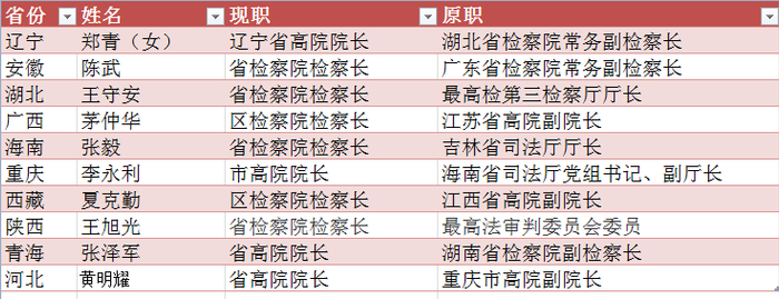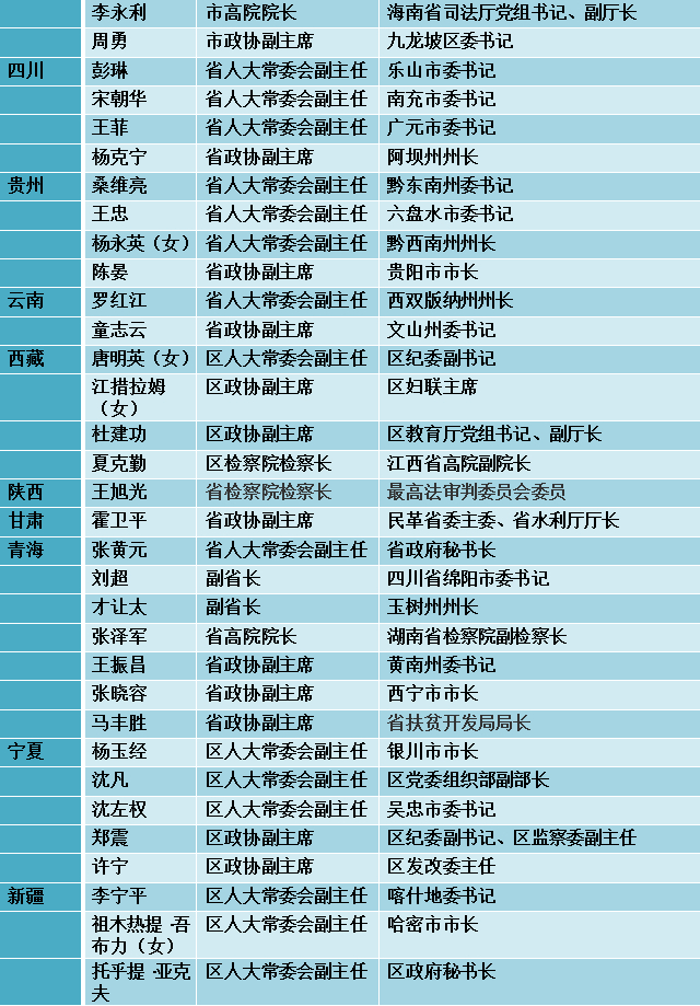 其次是省级高院和省级检察院一把手。在此轮省级两会上,共有辽宁、安徽、湖北、广西、海南、重庆、西藏、陕西、青海、河北等省份10名高院院长、检察院检察长当选。