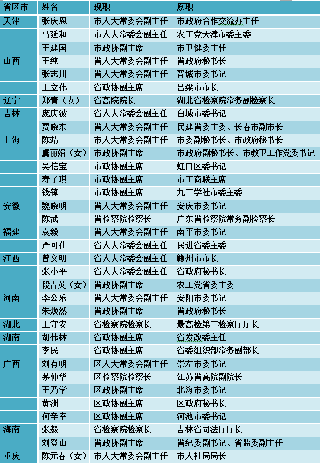 如山西省晋城市委书记张志川,吉林省白城市委书记庞庆波,上海市虹口区委书记吴信宝,福建省南平市委书记袁毅,广西壮族自治区崇左市委书记刘有明等,他们的履新去向大多是省级人大常委会副主任或省级政协副主席。四川省人大常委会此次新晋的三名副主任,均来自地级市的市委书记,他们是乐山市委书记彭琳, 南充市委书记宋朝华,广元市委书记王菲。