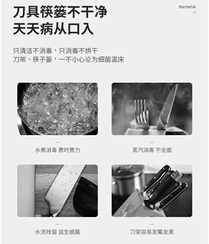 目前,市面上鲜有具备全面消毒烘干功能的刀筷架,偶见商用电器中会有针对筷子消毒的设备,但是杀菌率低和占地面积大是它们无法进入家庭厨房的重要原因。
