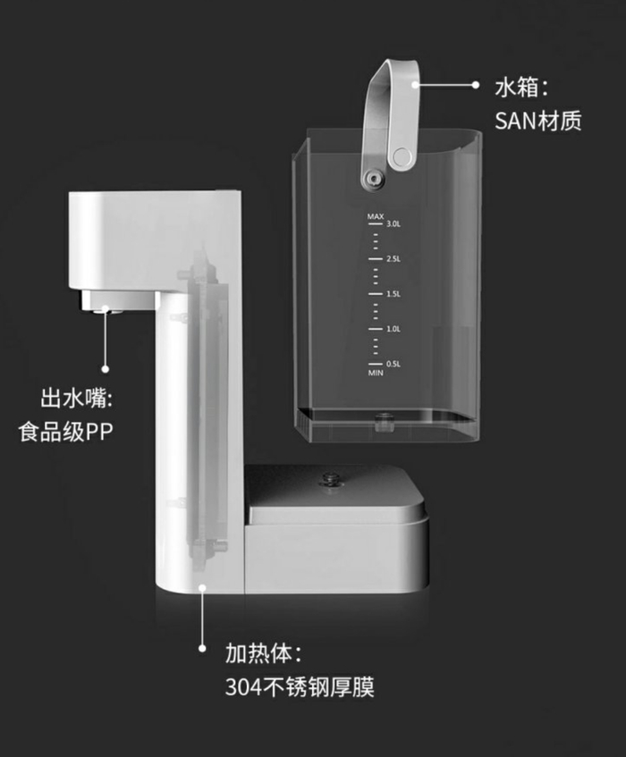 稀土厚膜发热材料,螺旋热水流动结构,加热快、0等待,拒绝千滚水与阴阳水。