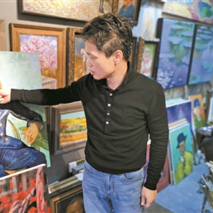 4年过去了,赵小勇依然生活在之前的画室中,没有换一个更大的地方。二三十平方米的画室内,弥漫着颜料的味道;不过在大芬村,他的名气如今可不小。走在路口打听“赵小勇”的画室,几乎所有的画师都知道。走进画室,赵小勇正聚精会神地调制颜料,画着梵高的一幅作品。