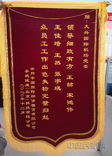 中国民航网 通讯员谢安忆、彭林 报道:“包内物品对我来说非常重要,真的太感谢你们了!”近日,一面写着“众员工工作出色 失物完璧归赵”的锦旗送给北京大兴国际机场党委,用以感谢大兴机场失物招领的温暖善举。